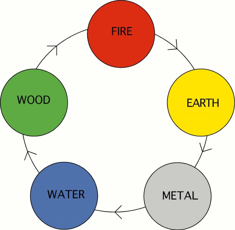 The Five Element cycle is a cyclical sequence of creation and control, and the elements are said to influence each other in the following way:
